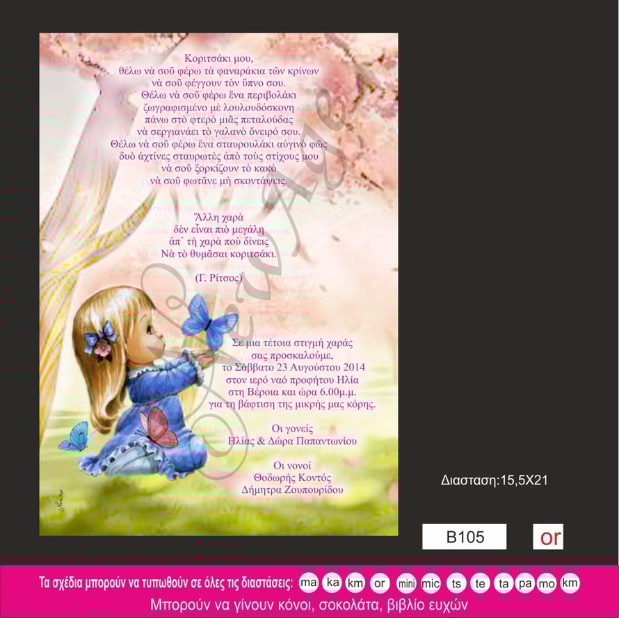 Προσκλητήριο Βάπτισης  Κοριτσάκι πεταλούδες       B105 or
