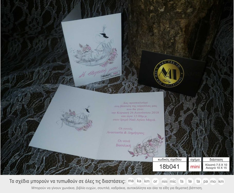 Προσκλητήριο βάπτιση κύκνος με λουλούδια σε σχήμα mini.