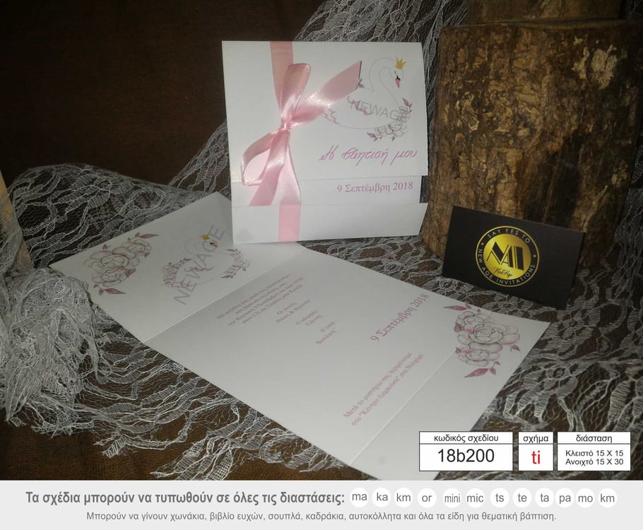Προσκλητήριο βάπτισης κύκνος με λουλούδια.