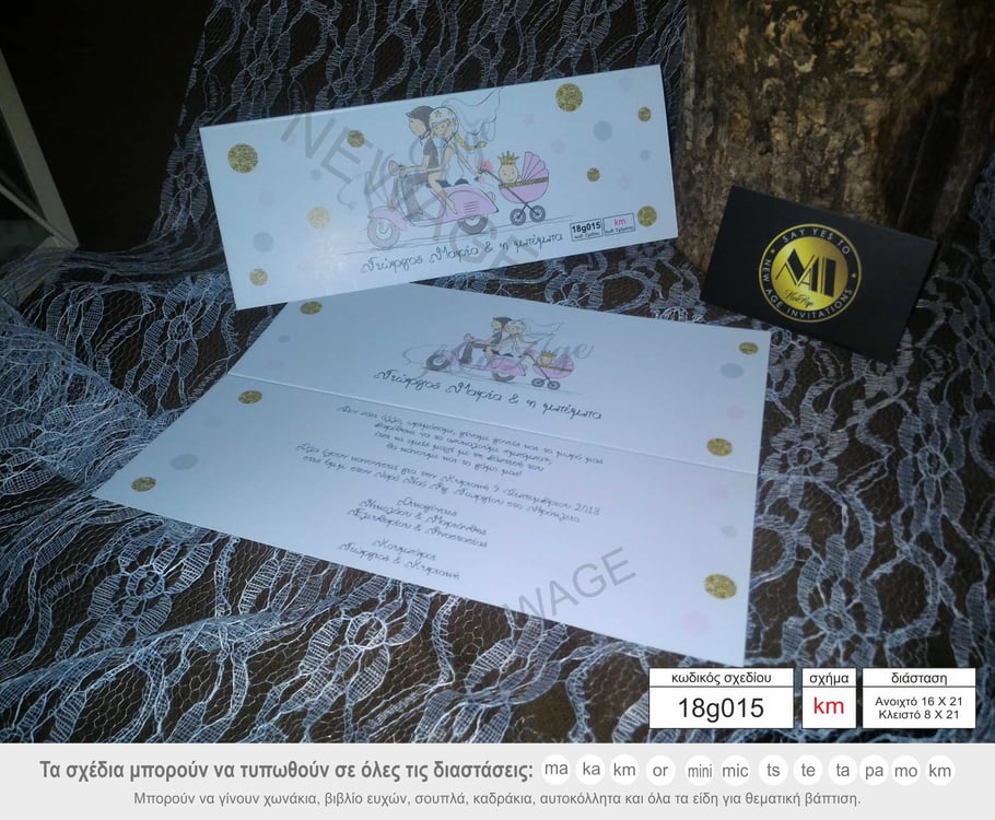 Προσκλητήριο γάμου με νεόνυμφους σε βέσπα και το μωράκι τους, ιδανικό για γάμο μαζί με βάπτιση.