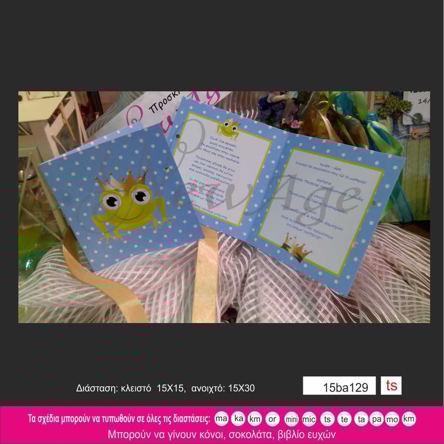 Προσκλητήριο βάπτισης πριγκιπικό βατραχάκι με κορόνα σε πουά φόντο.