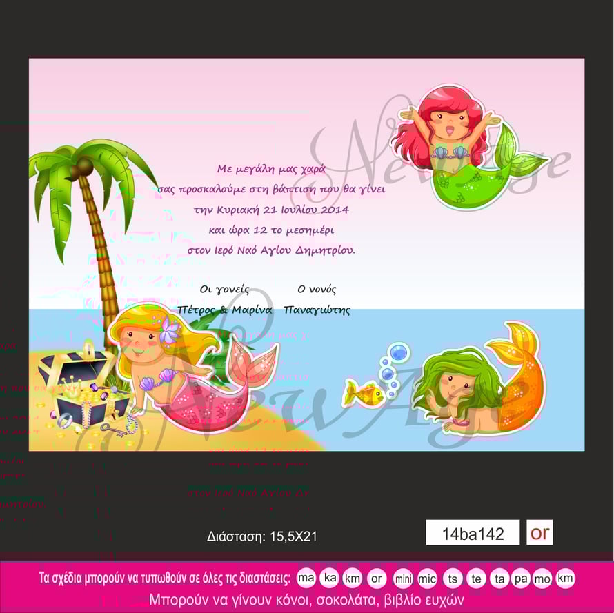 Προσκλητήριο βάπτισης με μια χρυσή παραλία με φοίνικες θησαυρό και πολλές γοργόνες.