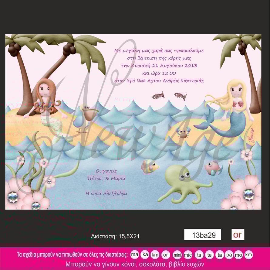 Προσκλητήριο βάπτισης για κορίτσι με θάλασσα με γοργόνες που κάνουν ηλιοθεραπεία.