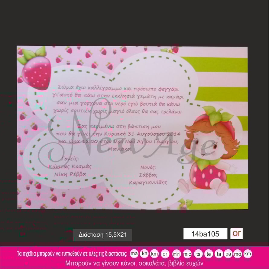 Προσκλητήριο βάπτισης με την φραουλίτσα και φόντο ριγέ λαχανί μα πολλές φράουλες.