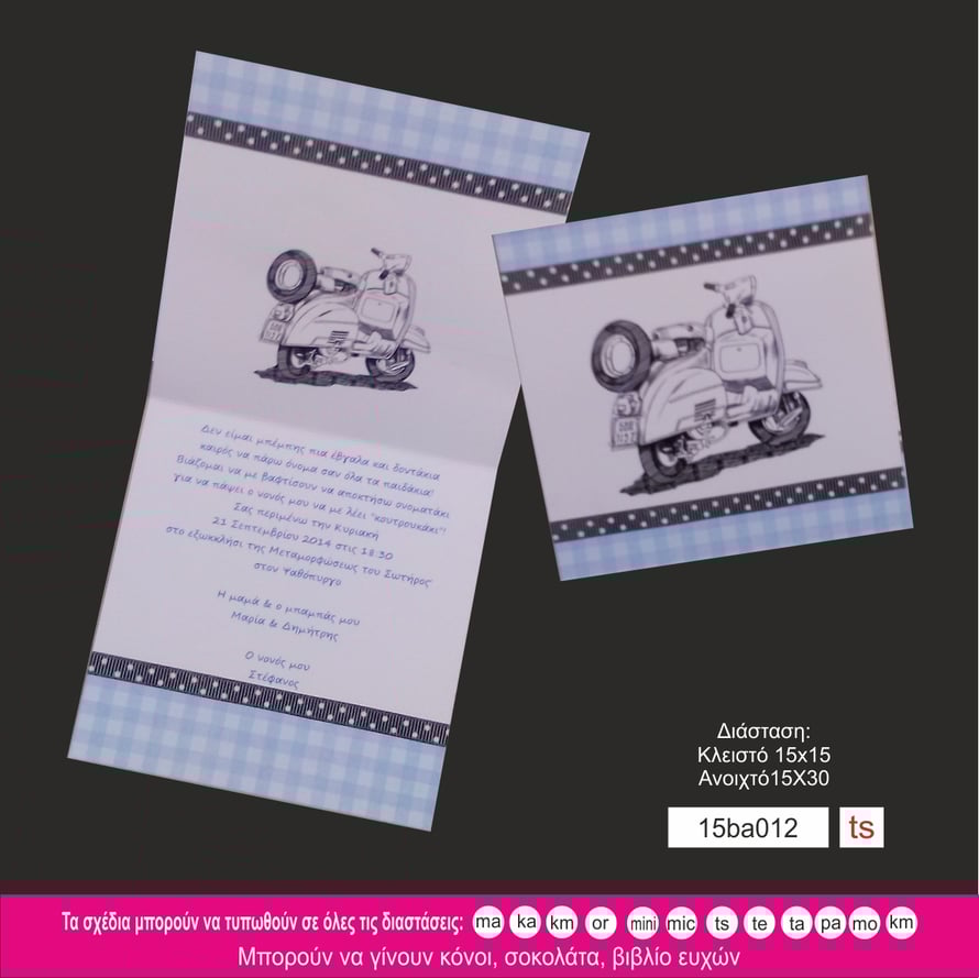 Προσκλητήριο βάπτιση με βέσπα σχεδιασμένη σε πουά σιέλ φόντο.